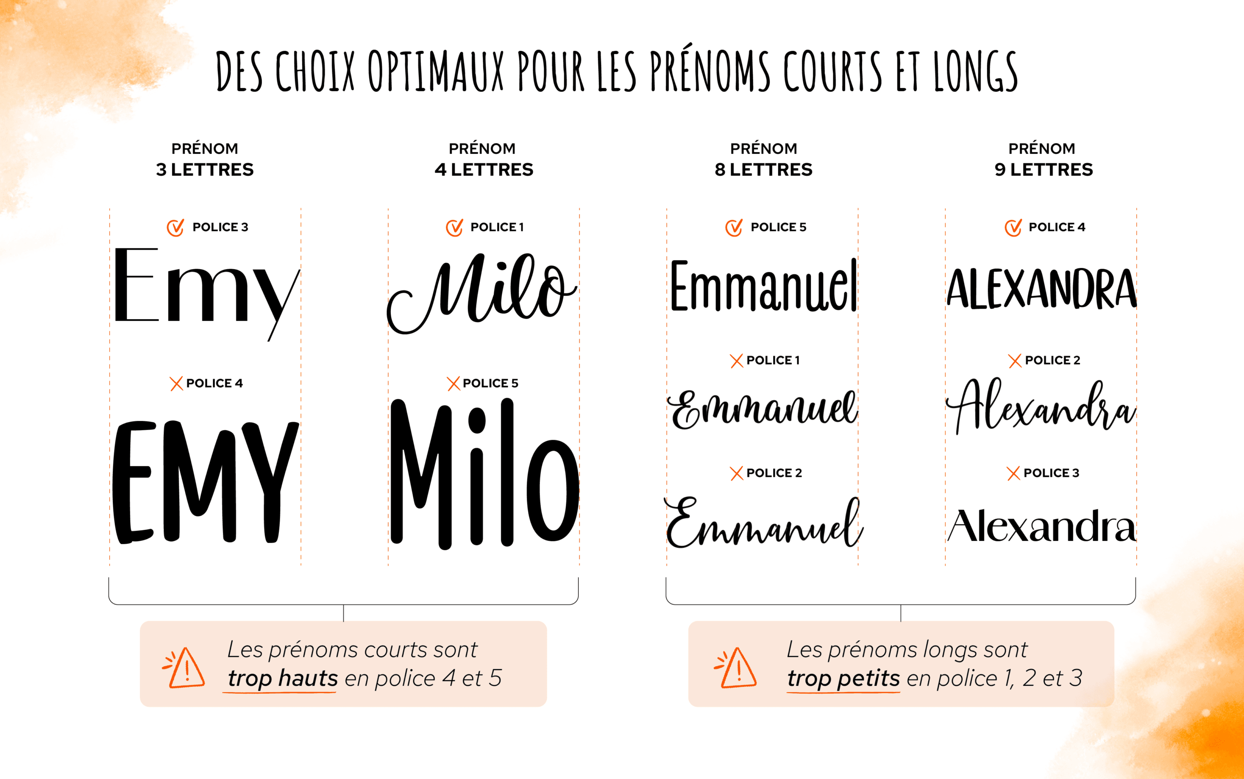 → Pour les prénoms longs, je recommande les polices 4 et 5 car elles gardent une bonne lisibilité.